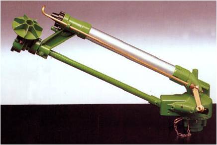 原理:其喷头的转动机构是一个装有弹簧的摇臂,在摇臂的前端有一个挡水板和一个导流板。当开始喷灌时,水舌通过挡水板或直接冲到导流板上,并从侧面喷出。水流的冲击力使摇臂发生转动,并把摇臂弹簧扭紧,然后在弹簧弹力作用下摇臂又回位,使挡水板和导流板切入水舌。在摇臂惯性力和水舌对挡水板切向附加力的作用下,敲击喷体使喷管转动。