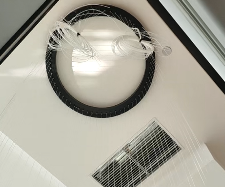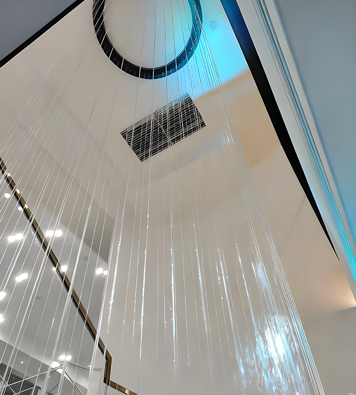 拉线水帘是建筑设计美学的点睛之笔,细线的垂落轨迹打破空间的规整感,让视线在流动中自然延伸;科技感与艺术感在此碰撞出独特的空间张力。当水帘成为空间的“呼吸系统”,它让科创中心不止是工作场域,更成为艺术与科技共生的灵感,每一缕细线的轻晃,都是创意在空间里生长的注脚。